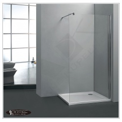 Jednoduchá jednodielna zástena do sprchovacieho kúta je vyrobená z 6 mm číreho tvrdeného bezpečnostného skla. K stene je pripevnená nerezovou oceľovou vzperou.